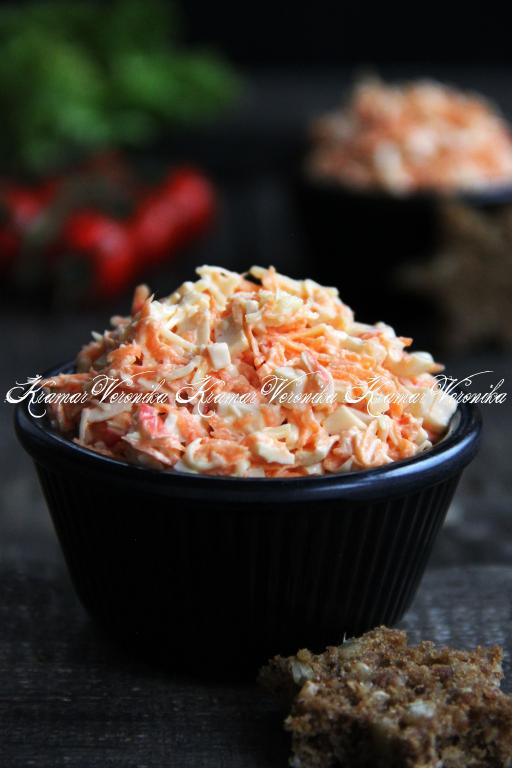 Хочу предложить простой и быстрый рецепт приготовления салата из сырой моркови, крабовых палочек и сыра. Салатик подойдёт для перекуса или в качестве дополнения к основному блюду. Этот вкусный, яркий, нежный салат можно подать в одном салатнике или порционно, наполнив им тарталетки. Всем советую приготовить салат по этому рецепту!