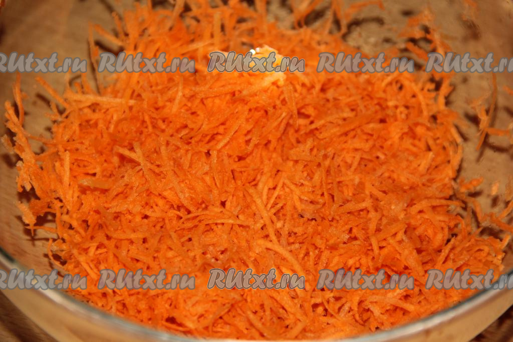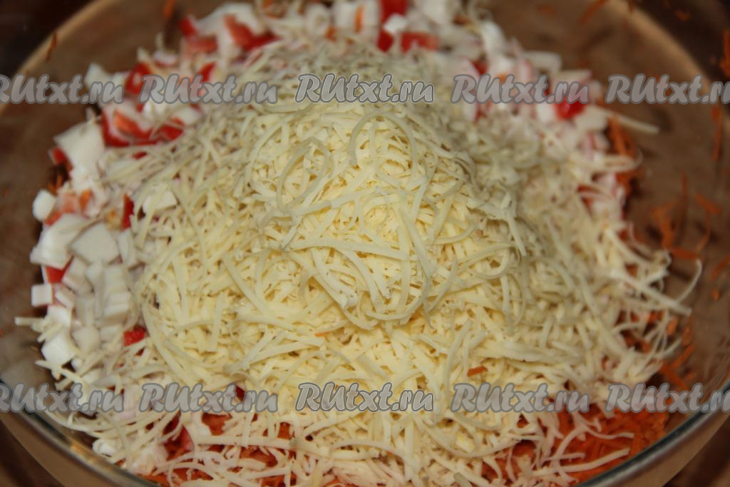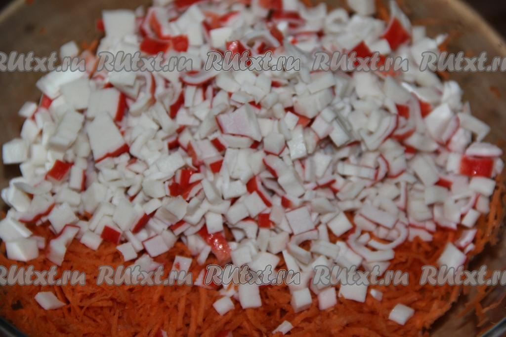 Разморозить при комнатной температуре крабовые палочки, очистить их от слюды, а затем мелко нарезать и выложить к натёртой моркови.