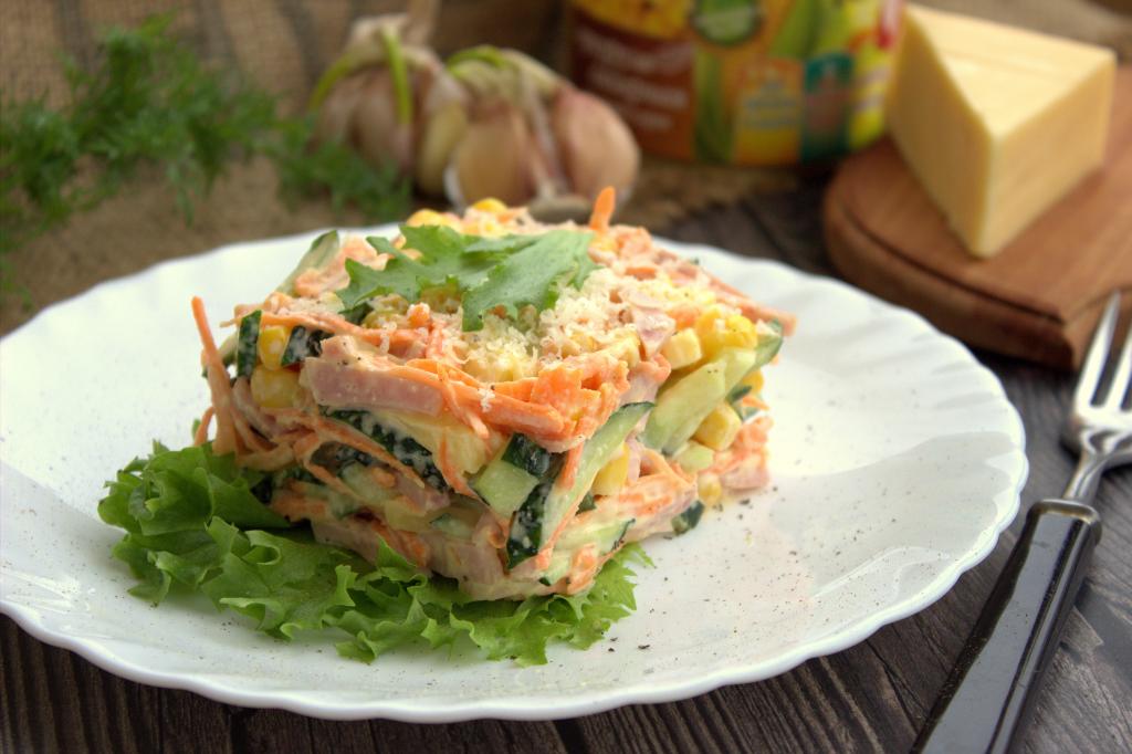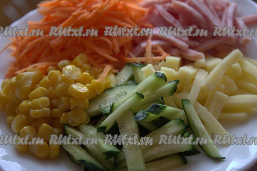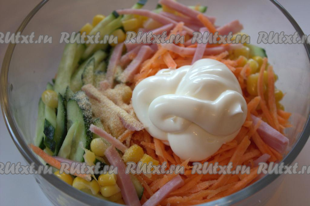 Соединить в миске сыр, морковку, колбасу и огурец, добавить консервированную кукурузу без жидкости.
