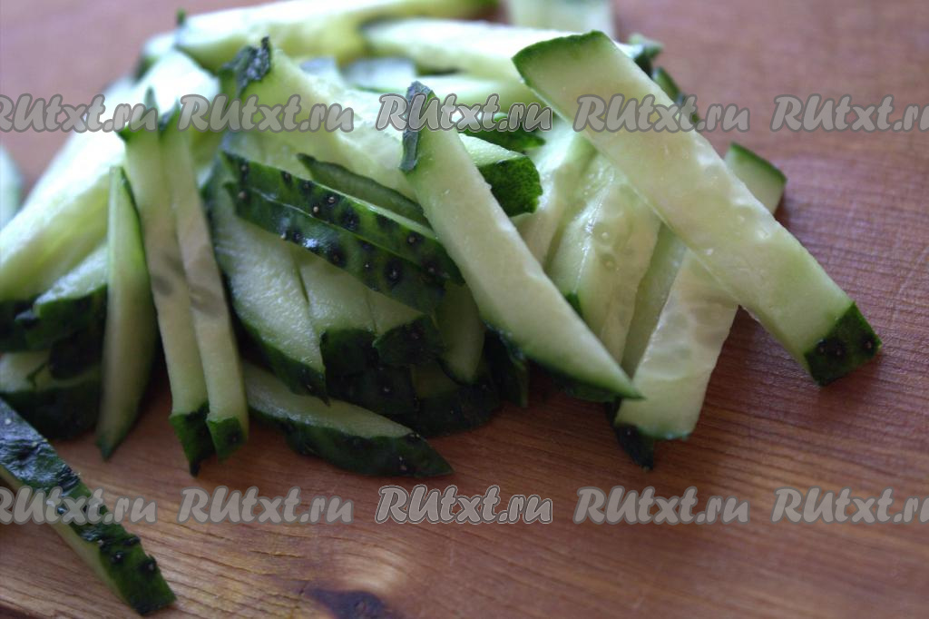 Огурец вымыть, нарезать тонкими полосками.