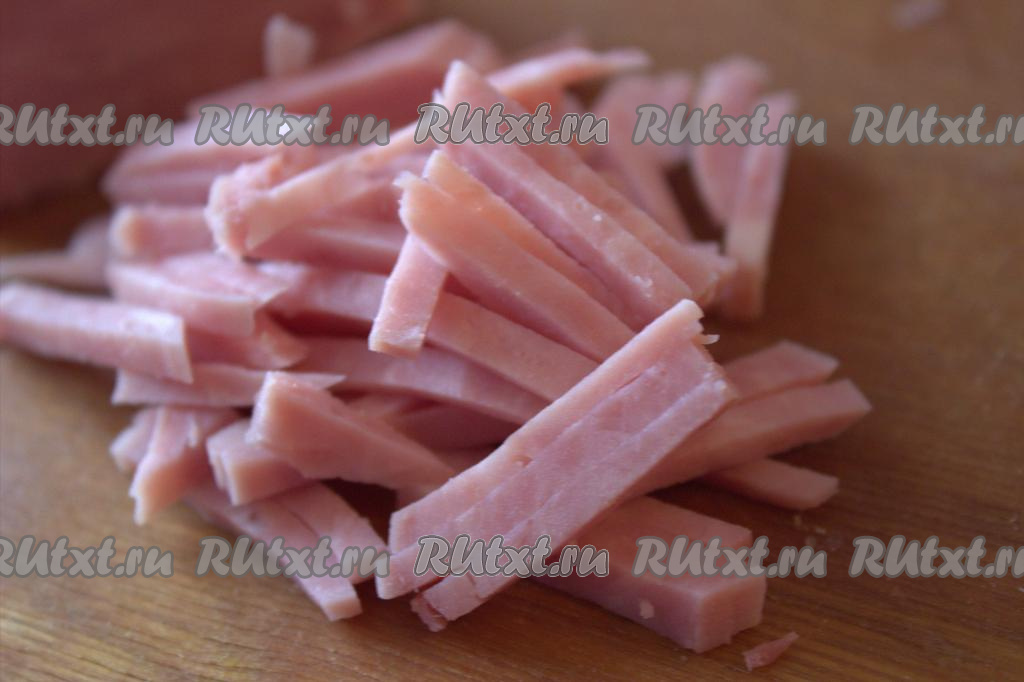 Колбасу (или ветчину) тоже нарезать тонкими полосками.