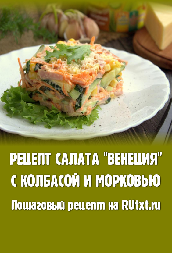 Салат "Венеция", приготовленный с колбасой и морковью, давно прижился в нашем семейном меню. Салатик готовится за считанные минуты, а получается ярким и очень вкусным. Сочетание колбасы и сыра придаёт блюду особую пикантность, а свежая морковка и огурец делают вкус более нежным и сочным. Отличный салат на скорую руку, попробуйте!