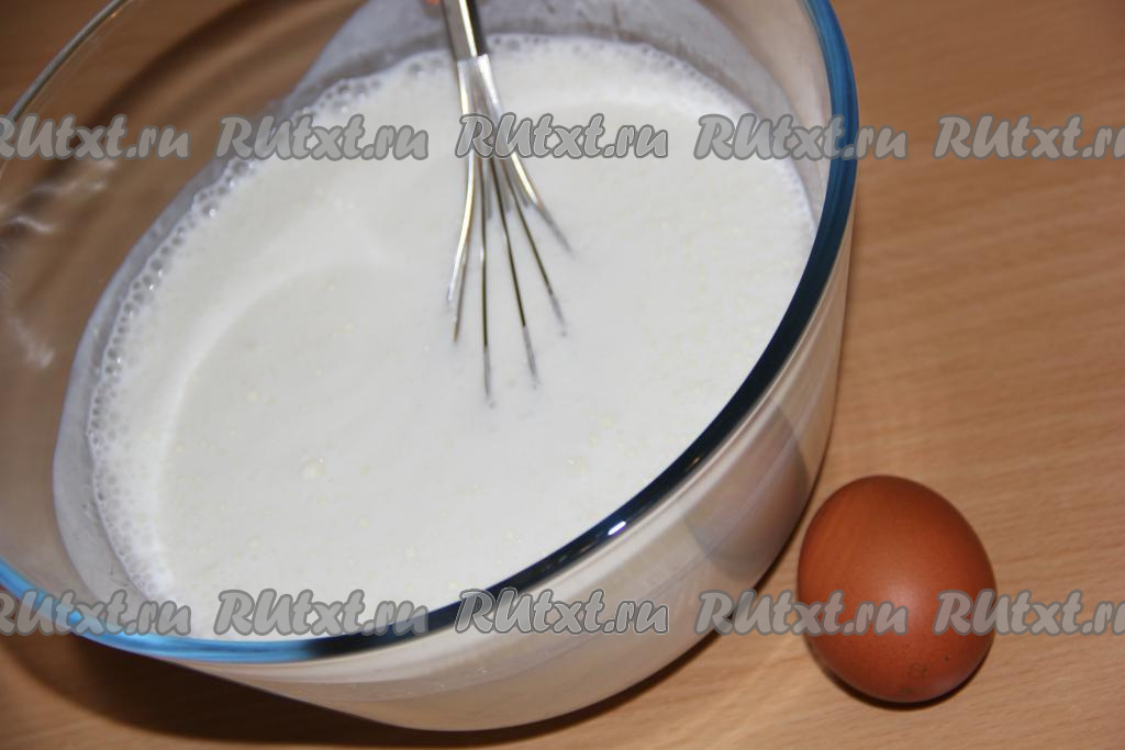 Кефирная смесь увеличится в объёме. В смесь кефира и соды добавить соль, яйцо и сахар, перемешать венчиком.