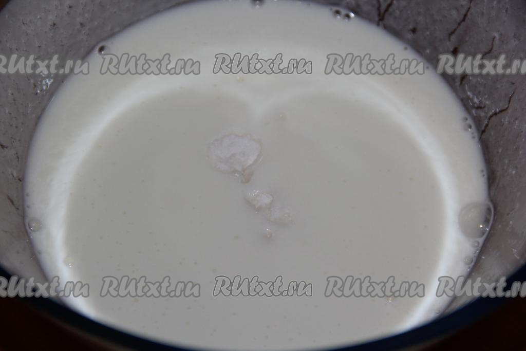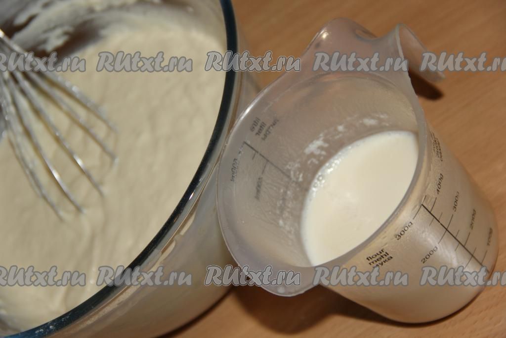 Молоко довести до кипения, а затем тонкой струйкой влить его в тесто, непрерывно и тщательно перемешивая.