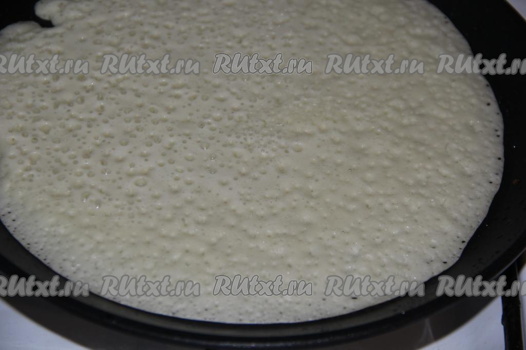 Я смазала сковороду растительным маслом только перед первым блином. Влить часть теста в разогретую сковороду и равномерно распределить по всей поверхности.