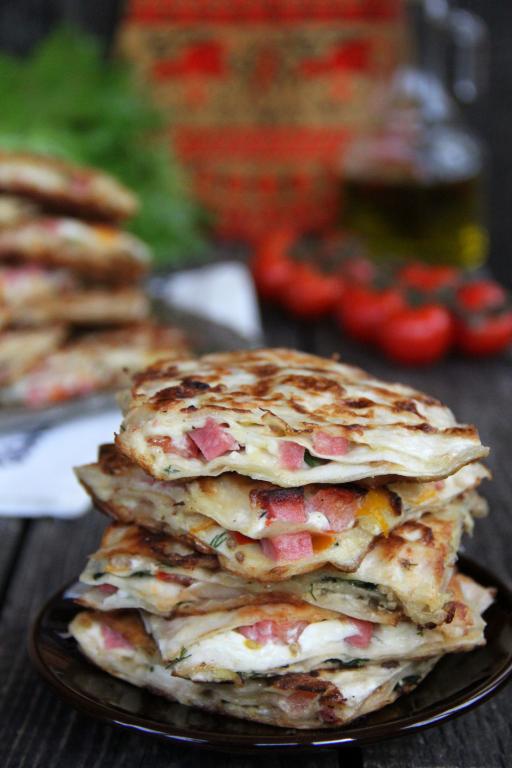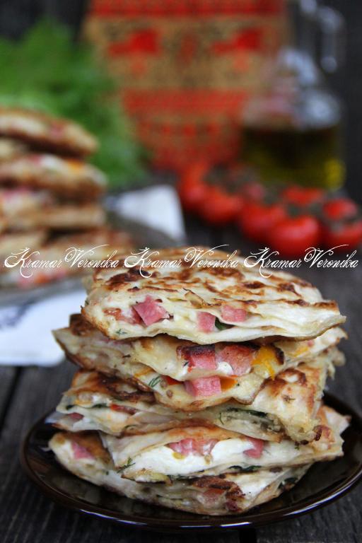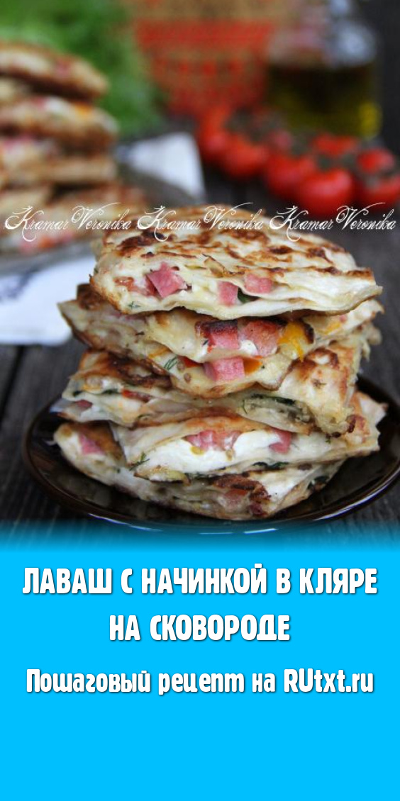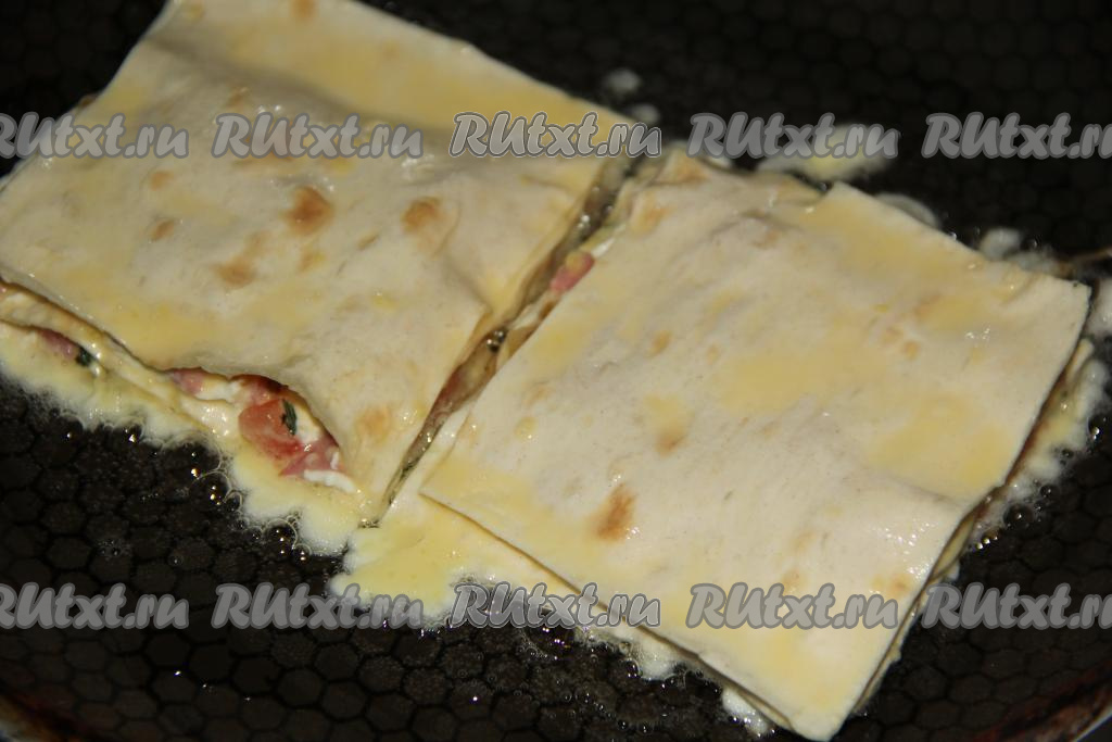 Сытный, аппетитный лаваш с начинкой, жареный в кляре на сковороде, подать в тёплом виде. Правда, и холодным он остаётся вкусным.