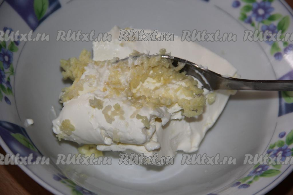 Творожный сыр (или майонез) соединить с чесноком, пропущенным через пресс, перемешать.