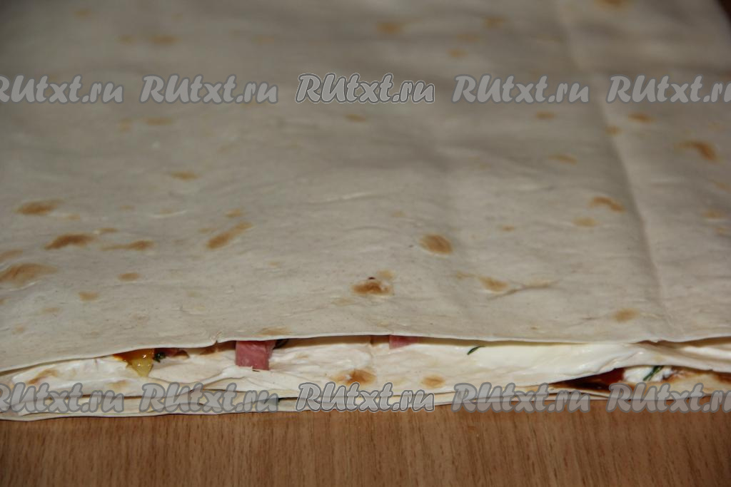 Накрыть начинку второй частью лаваша, слегка прижать. Смазать эту часть лаваша оставшейся смесью из творожного сыра и чеснока, посыпать оставшейся зеленью, выложить оставшиеся колбасу и помидоры. Накрыть третьей частью лаваша.
