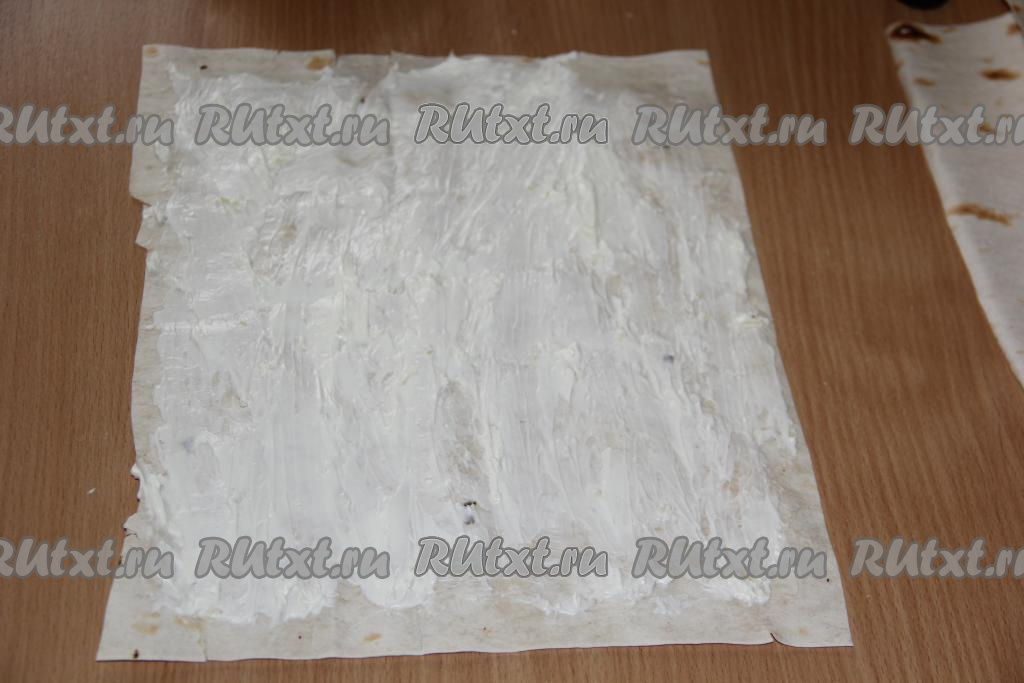 Одну часть лаваша, оставляя края лаваша чистыми, смазать половиной смеси из творожного сыра и чеснока.