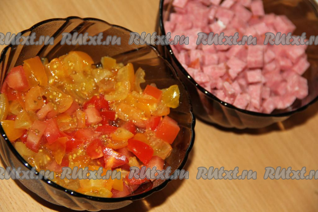 Колбасу нарезать на мелкие кубики. Вымытые помидоры нарезать достаточно мелко.