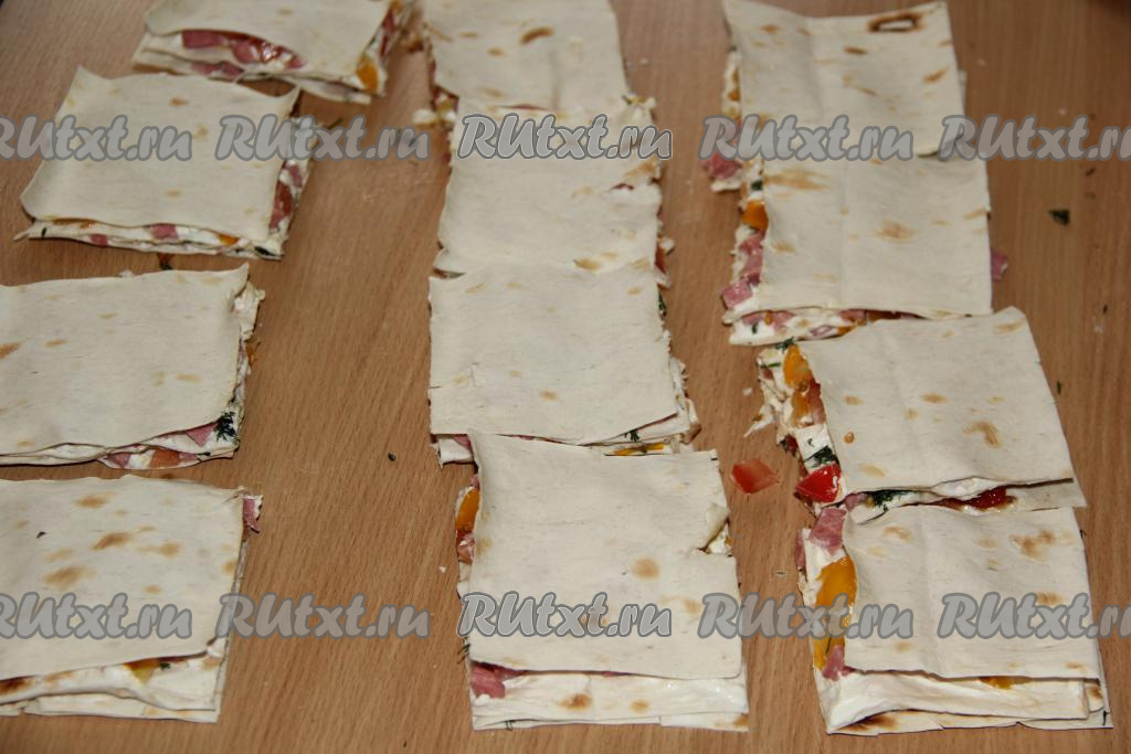 Разрезать лаваш с начинкой на квадратики размером, примерно, 8х8 см.