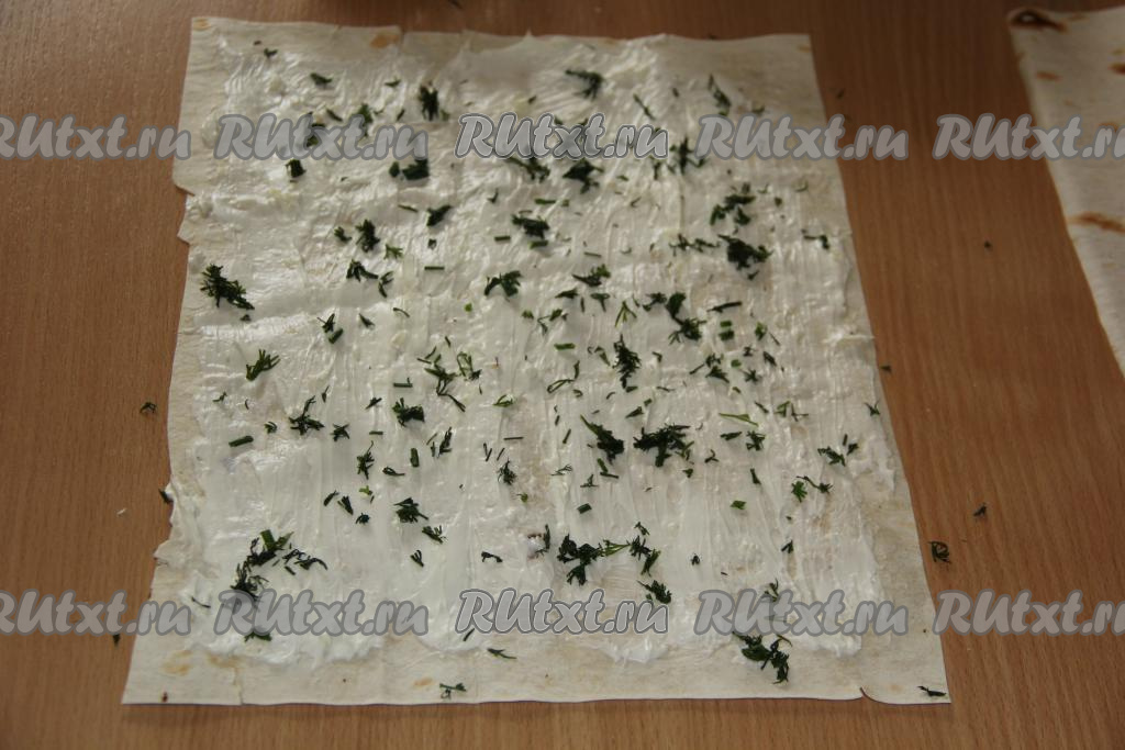 Вымыть, обсушить и мелко нарезать зелень. Половиной нарезанной зелени присыпать смазанную часть лаваша.