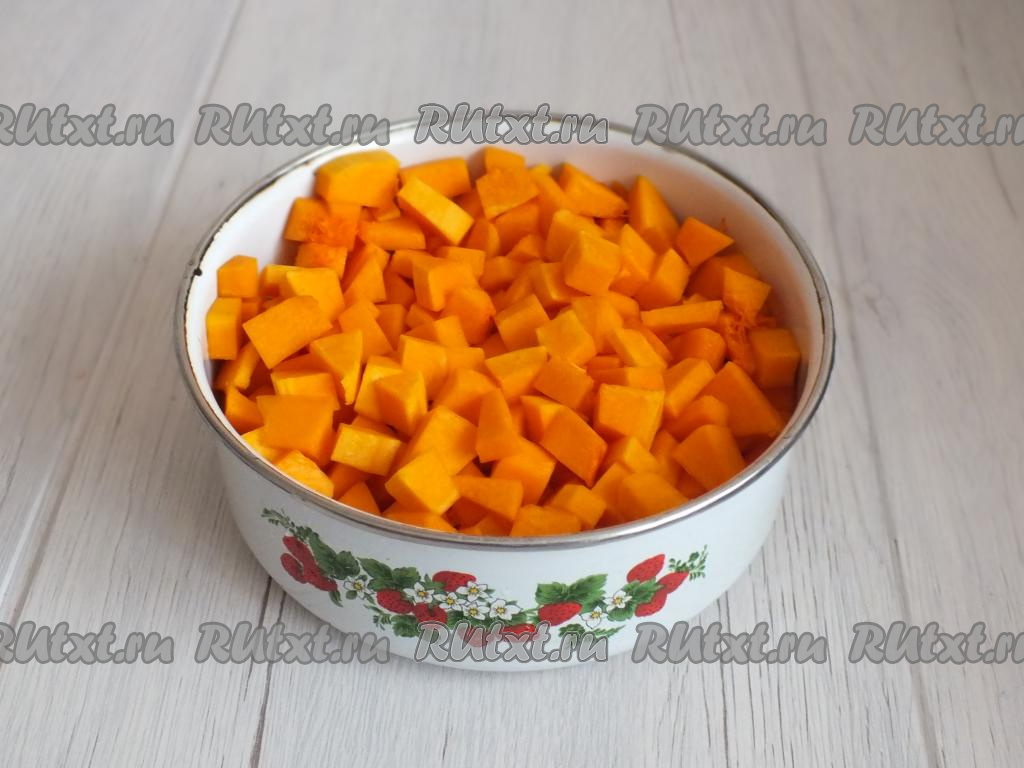 Подготовьте тыкву. Вымойте, снимите кожуру, удалите семечки. Нарежьте мякоть тыквы на кубики размером 1 см на 1 см, взвесьте 400 грамм - именно такое количество тыквы понадобится для приготовления варенья.