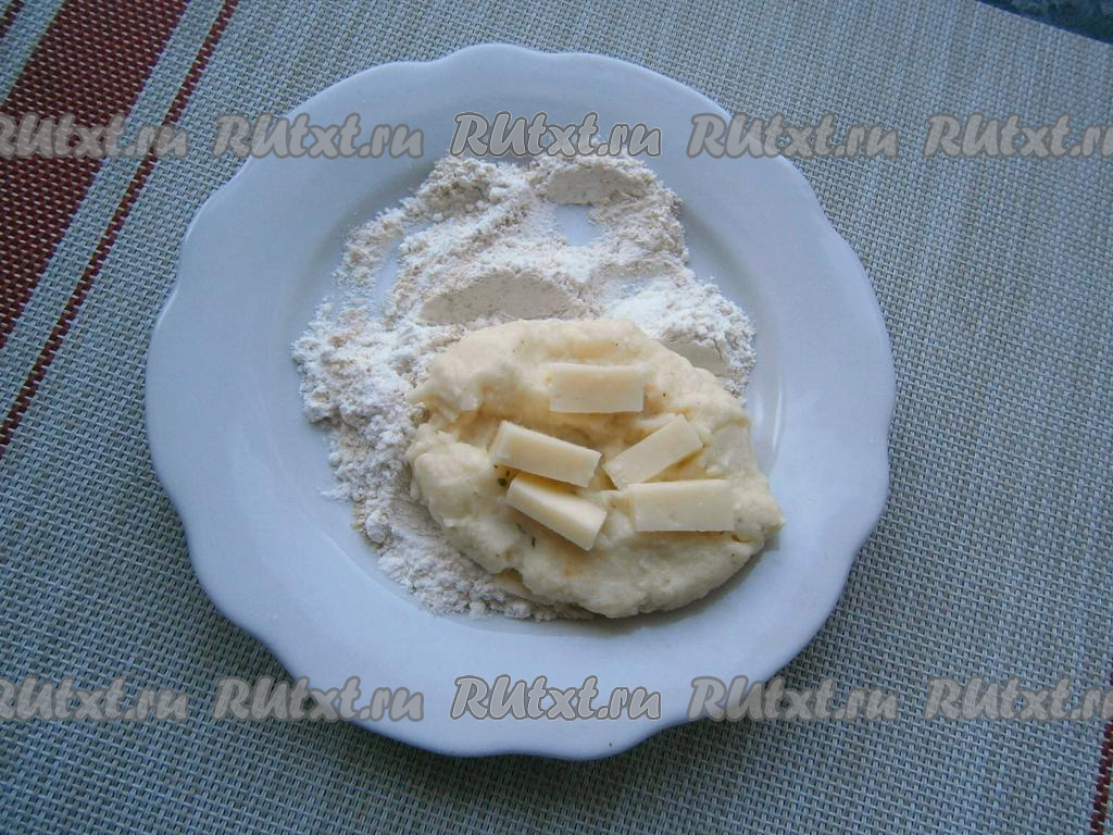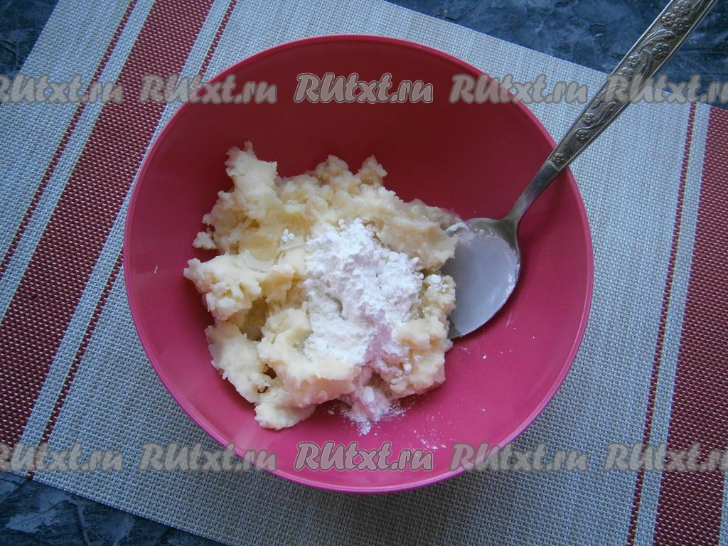 К охлаждённому или вчерашнему (из холодильника) картофельному пюре добавить растопленное не горячее сливочное масло и всыпать крахмал.