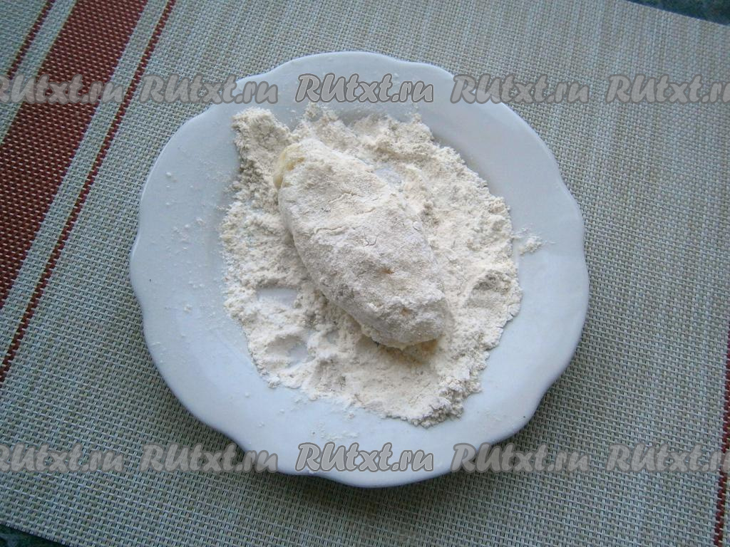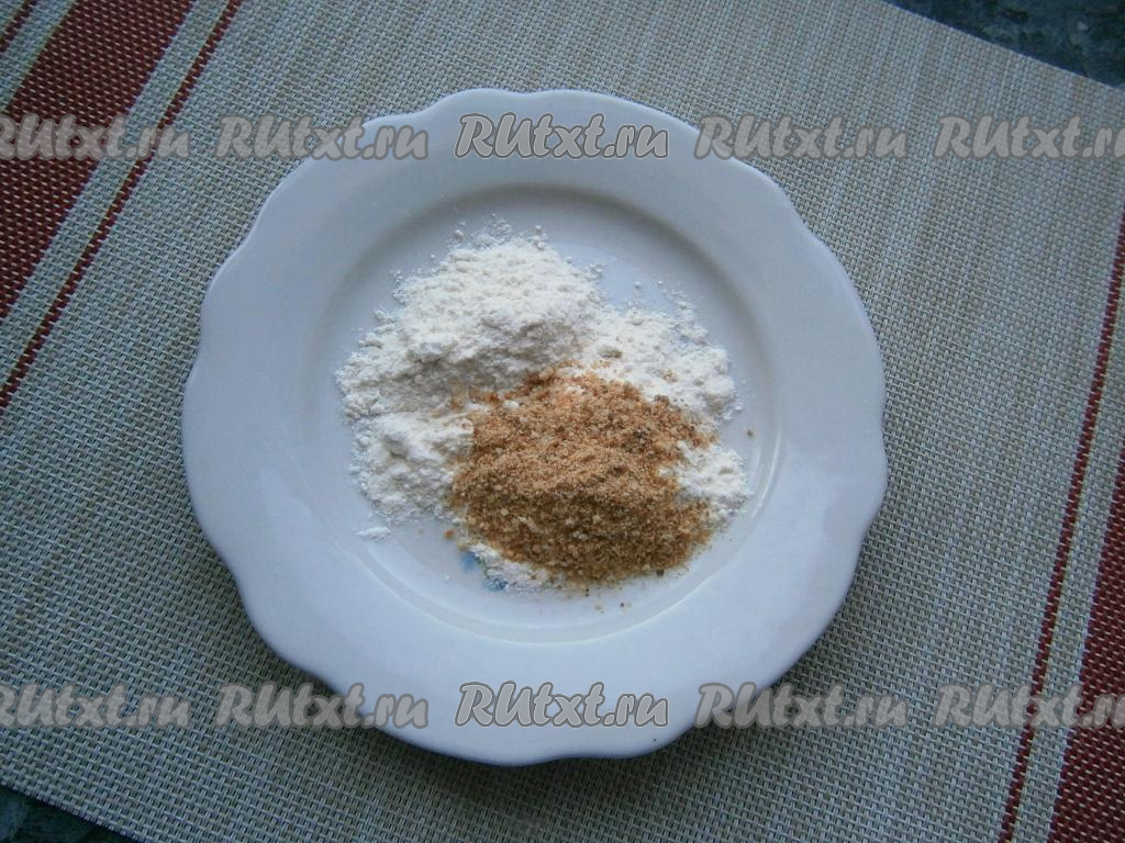 Муку смешать с панировочными сухарями в отдельной посуде.