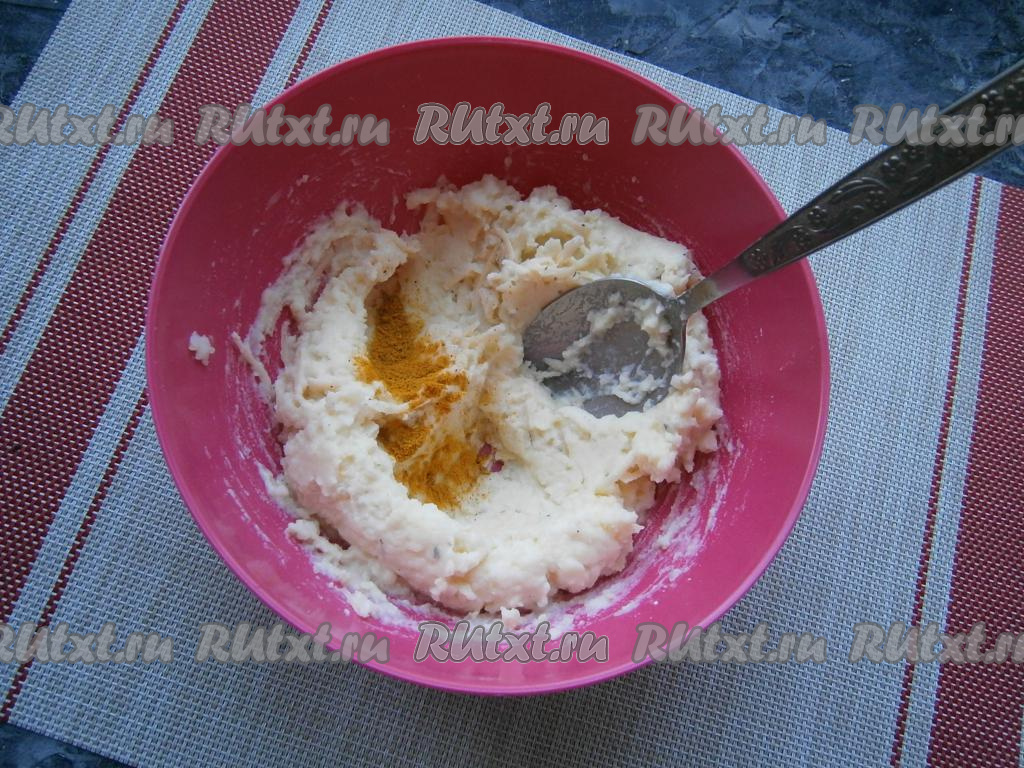 Сюда же добавить порошок карри и вмешать его в тесто.