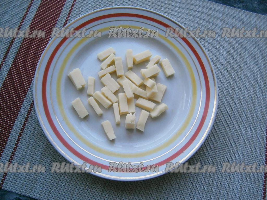 30 грамм сыра нарезать небольшими, короткими брусочками.