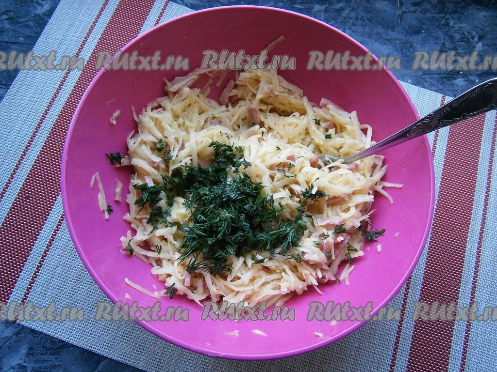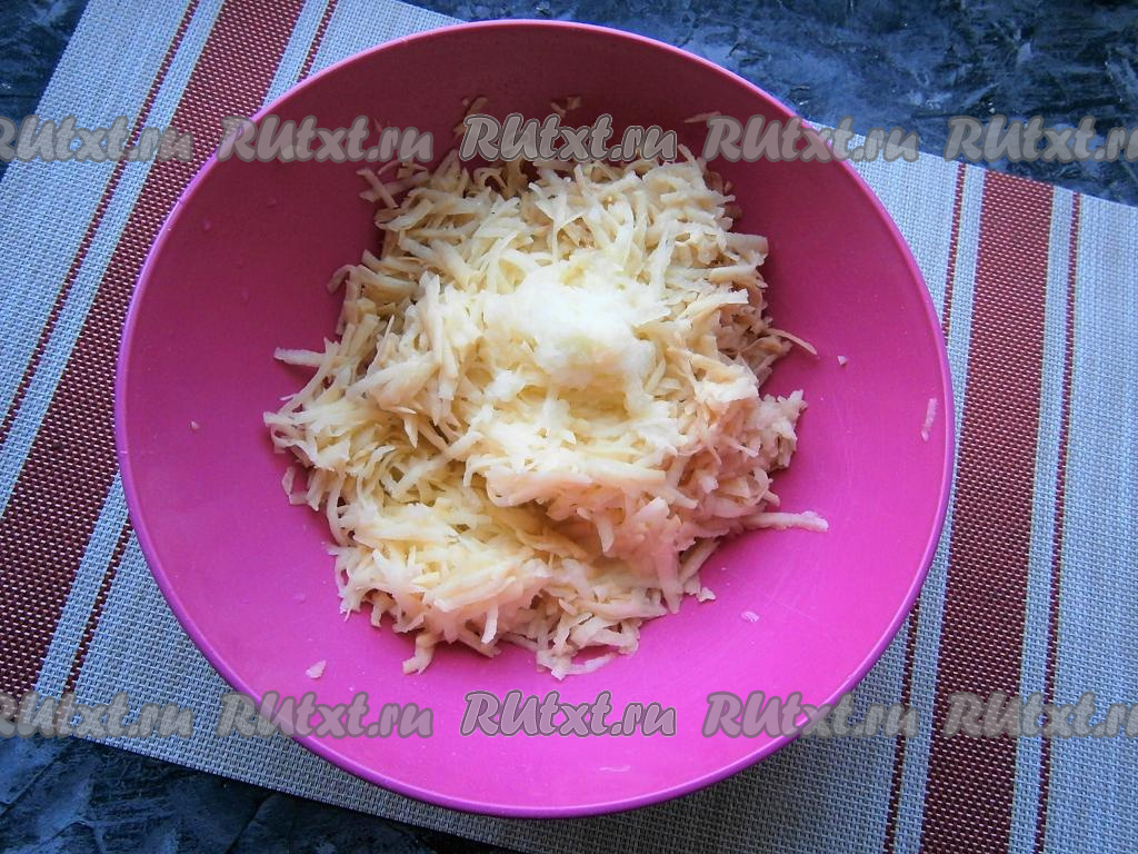 Натереть на крупной тёрке очищенный картофель, отжать его от жидкости. К получившейся картофельной массе добавить натёртый на тёрке очищенный репчатый лук.