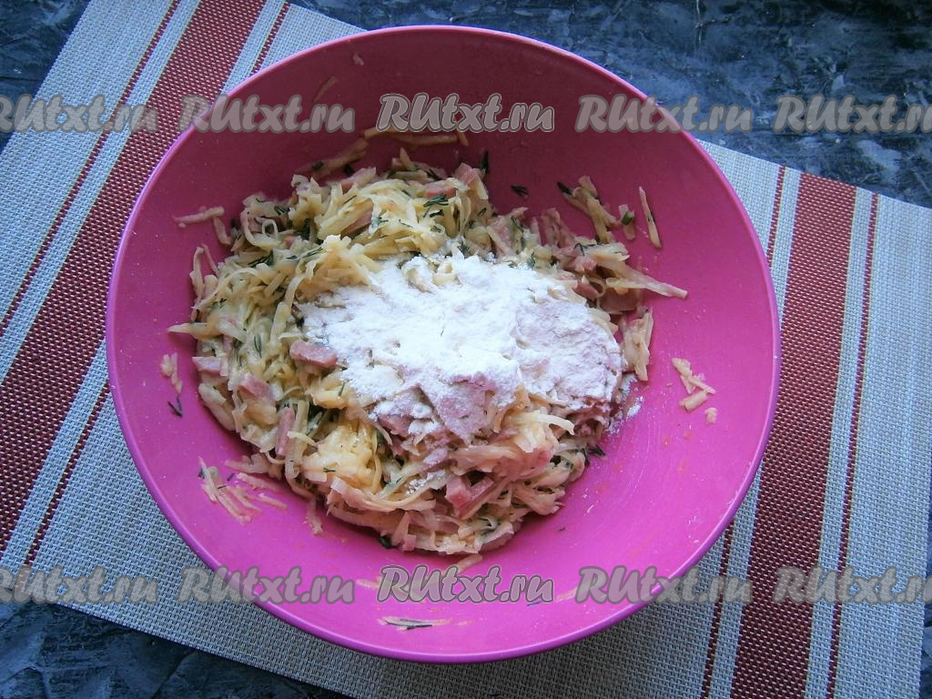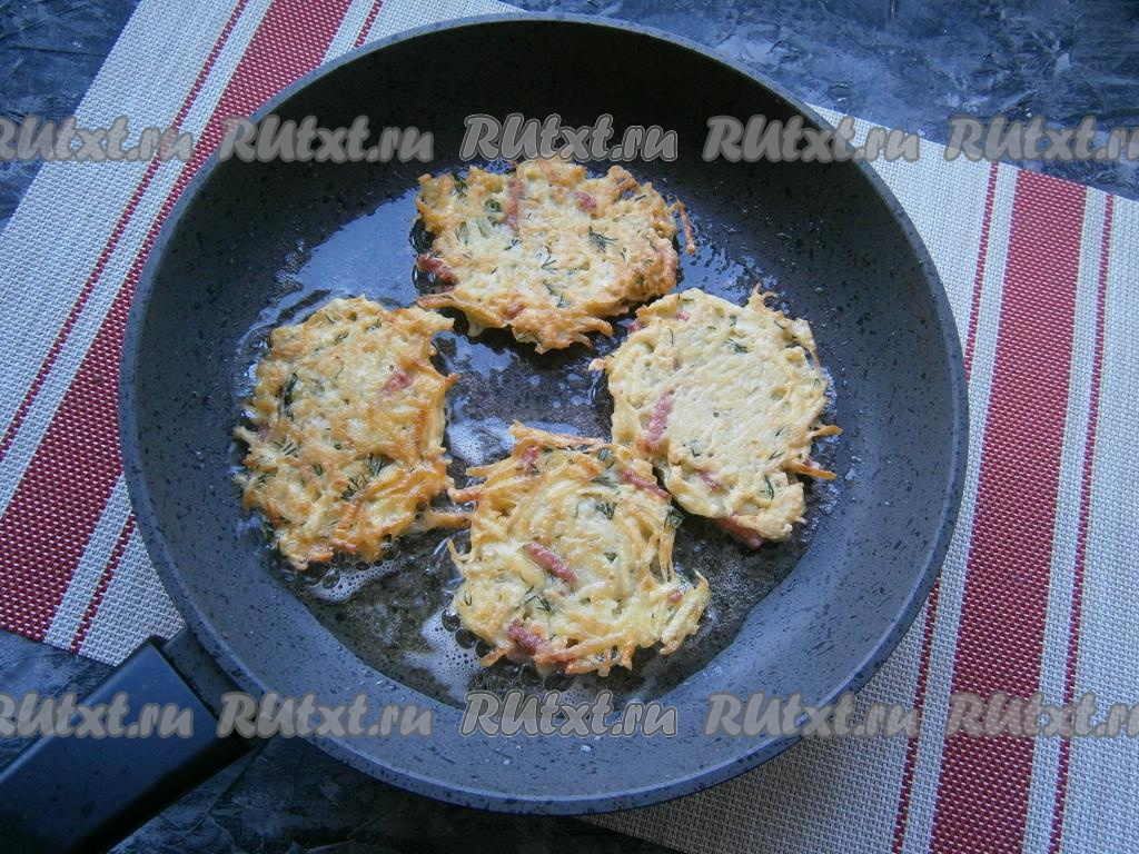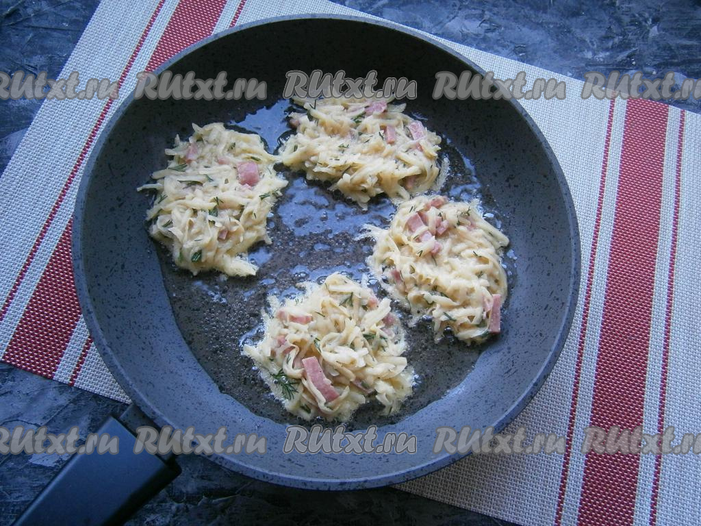 Ещё раз хорошо перемешать. Выкладывать картофельную массу столовой ложкой в виде оладий на сковороду, разогретую с растительным маслом.