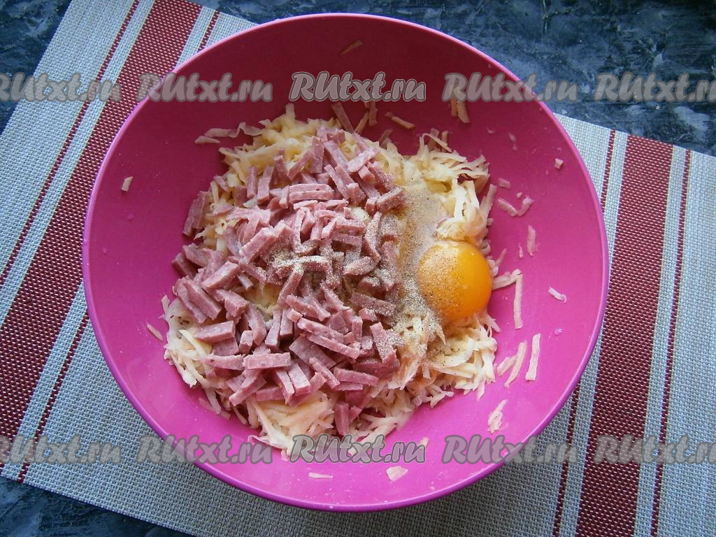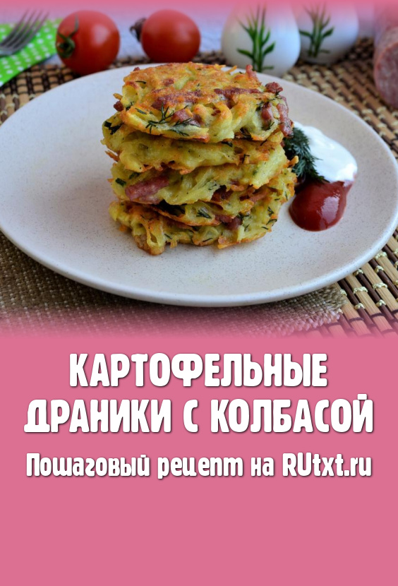 Подавать аппетитные, сытные, очень вкусные картофельные драники, приготовленные с колбасой, к столу горячими.