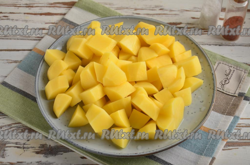 Пока варится бульон, почистите и вымойте картофель, нарежьте небольшими кубиками (или соломкой). Спустя 35 минут с начала варки бульона можно положить нарезанную картошку в кастрюлю, довести до кипения и уменьшить огонь.