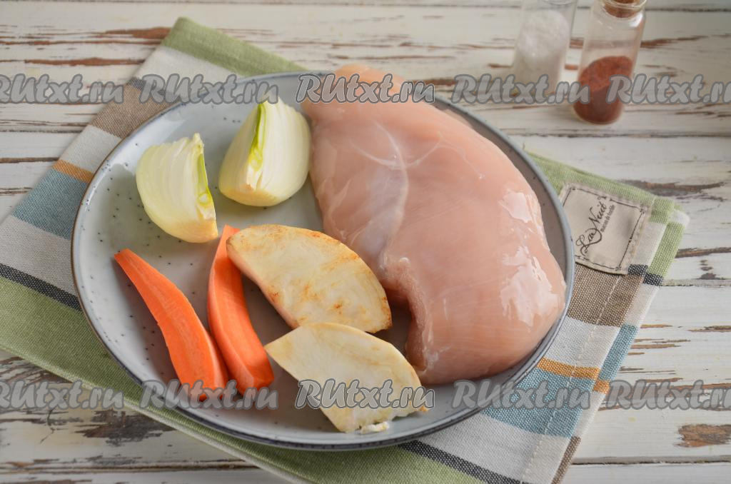 Сначала нужно поставить вариться куриный бульон. Помойте куриное филе (или другие части курицы), обрежьте всё лишнее. Вымойте и почистите морковь, лук, 50 грамм корня сельдерея. Куриное мясо, половинку луковицы, половинку моркови и 50 грамм корня сельдерея поместите в кастрюлю с водой, поставьте на огонь, после закипания снимите ложкой пену и варите минут 30-35 на небольшом огне.