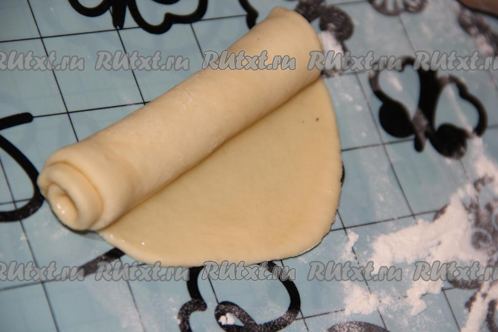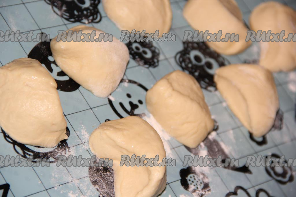 Готовое дрожжевое тесто выложить на стол и обмять, разделить на 18 частей.