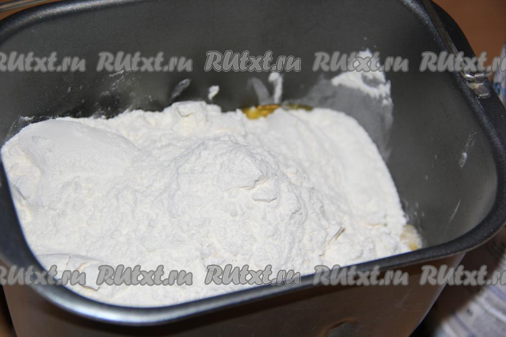 Всыпать просеянную муку, соль и установить режим "Замес теста" (в моей хлебопечке длительность этого режима 1,5 часа), крышку хлебопечки закрыть.