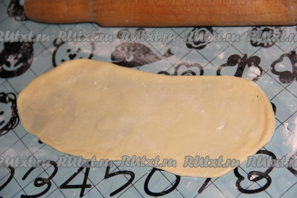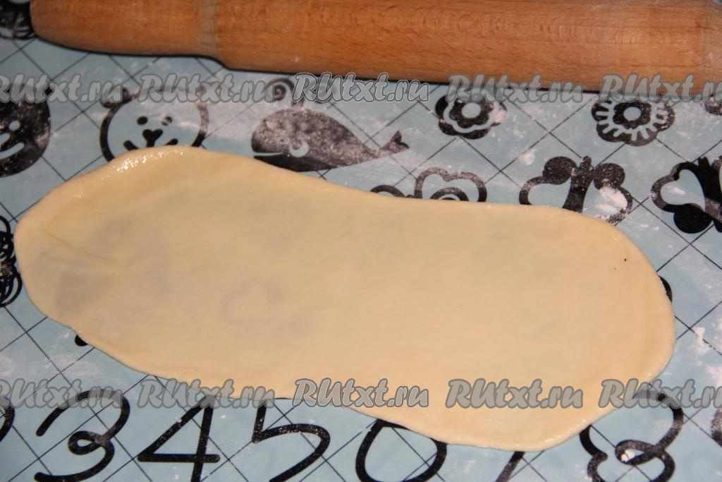 Каждую часть теста на столе, присыпанном мукой, раскатать скалкой в тонкий овал.