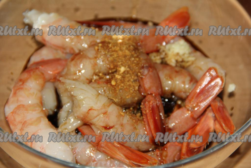 К лангустинам и чесноку добавить сок лимона, соевый соус и специи.