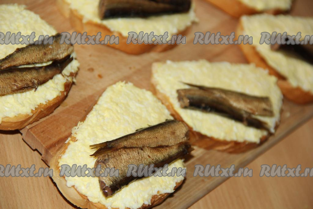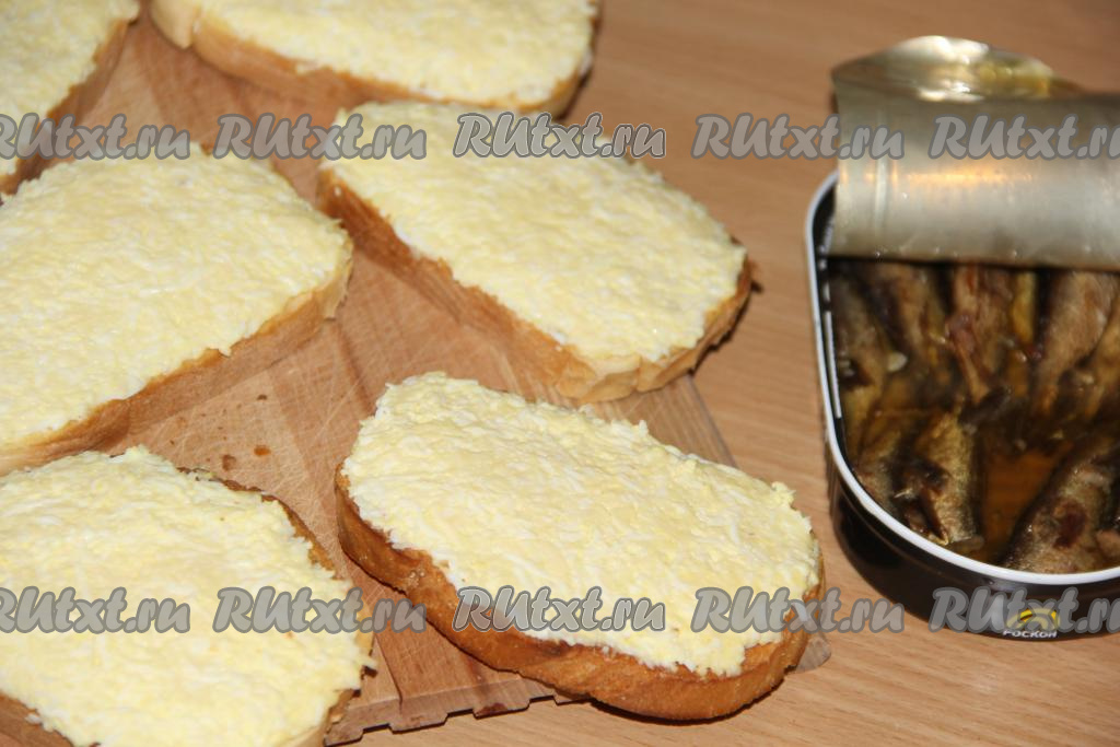 На каждый бутерброд, смазанный смесью яиц и майонеза, выложить по 2 шпротинки.