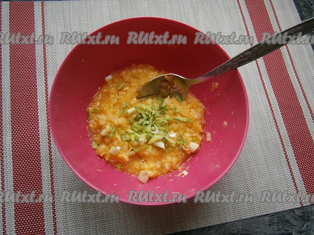 Перемешать и добавить измельчённый зелёный лук.