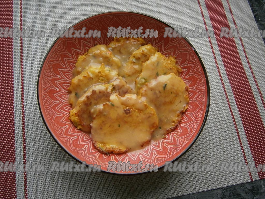 Этим соусом полить луковые оладьи и довести их до готовности в духовке, разогретой до 180 градусов, в течение 7-10 минут или в микроволновке в течение 1,5 минут при мощности 750 Ватт.
