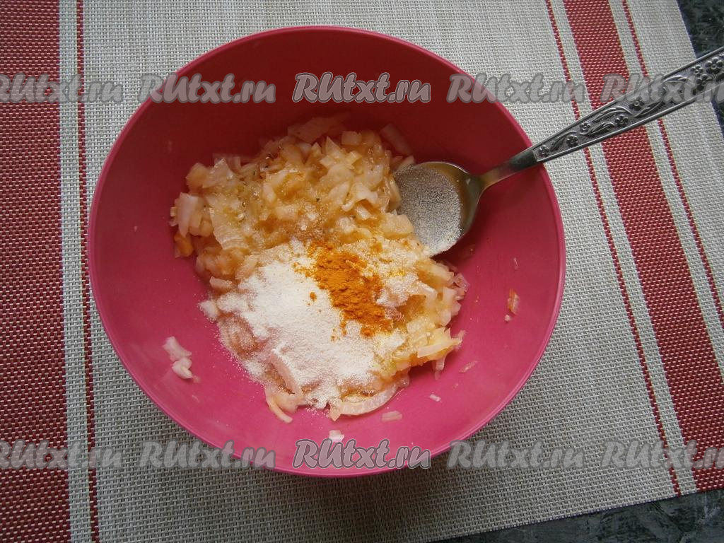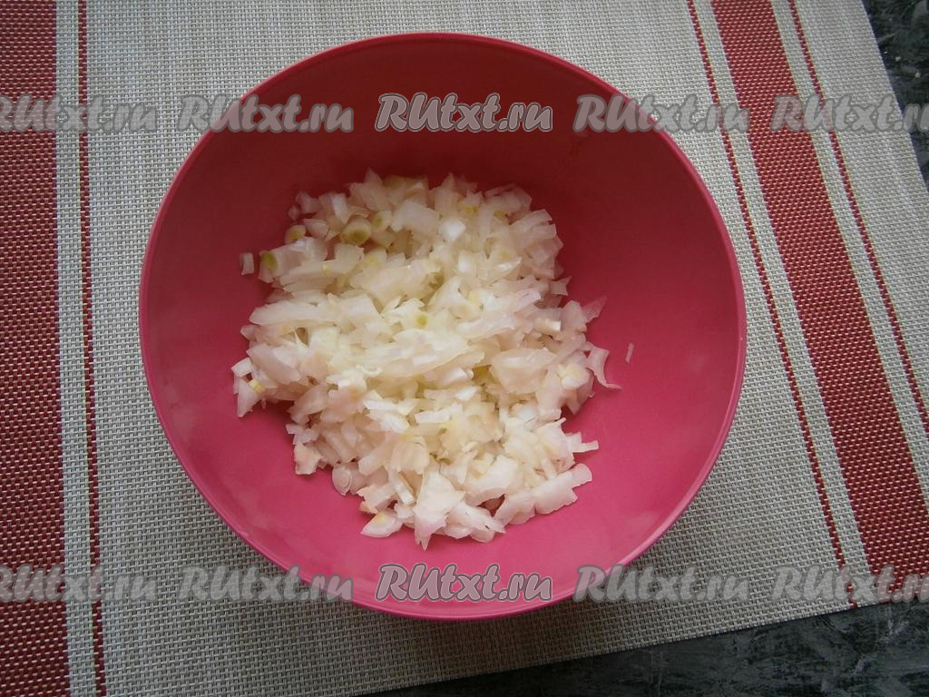Репчатый лук очистить и нарезать как можно мельче. Прокручивать лук через мясорубку не советую (получится кашица), можно измельчить в блендере, но не до состояния пюре.