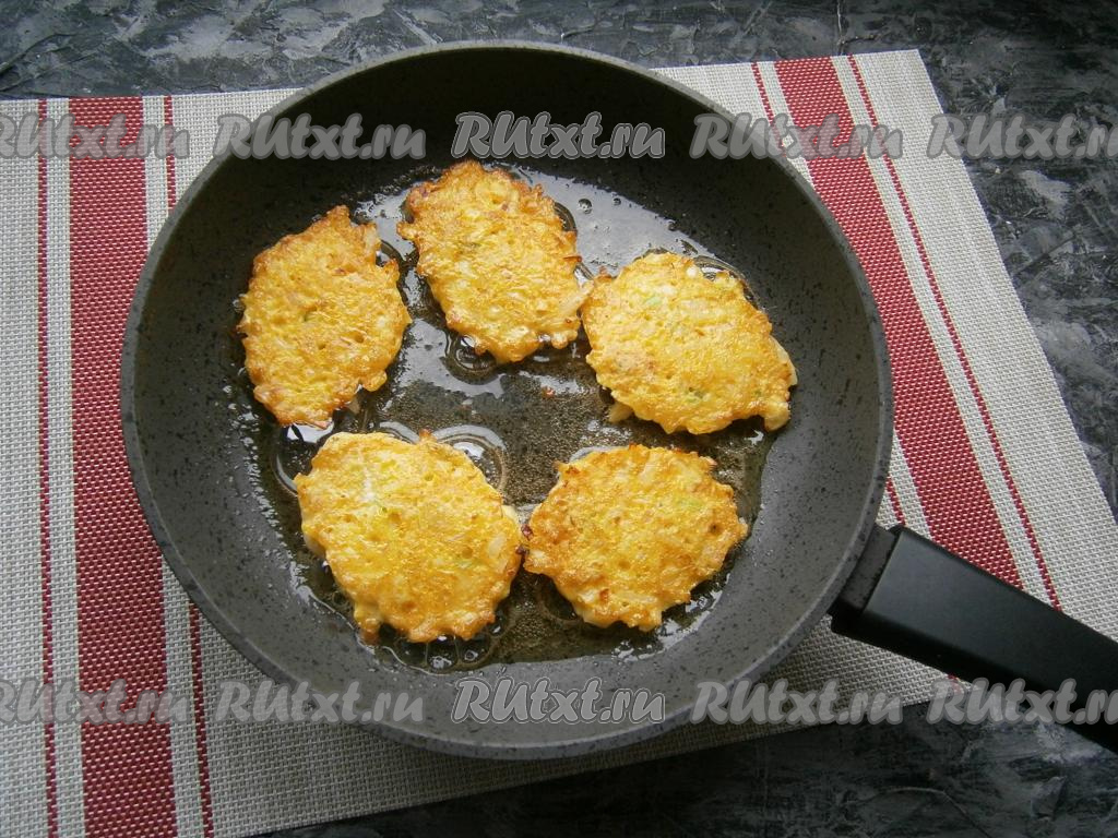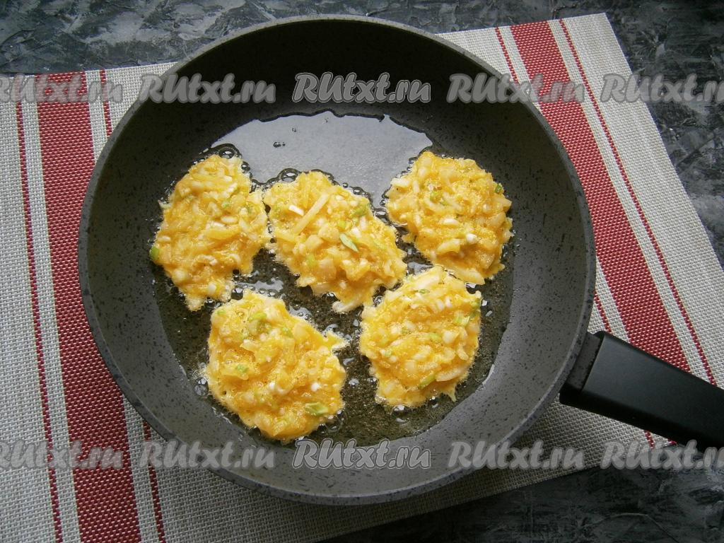 Массу из лука ещё раз перемешать и оставить минут на 10. После этого разогреть сковороду с растительным маслом и выложить луковую смесь ложкой в виде небольших оладушек.