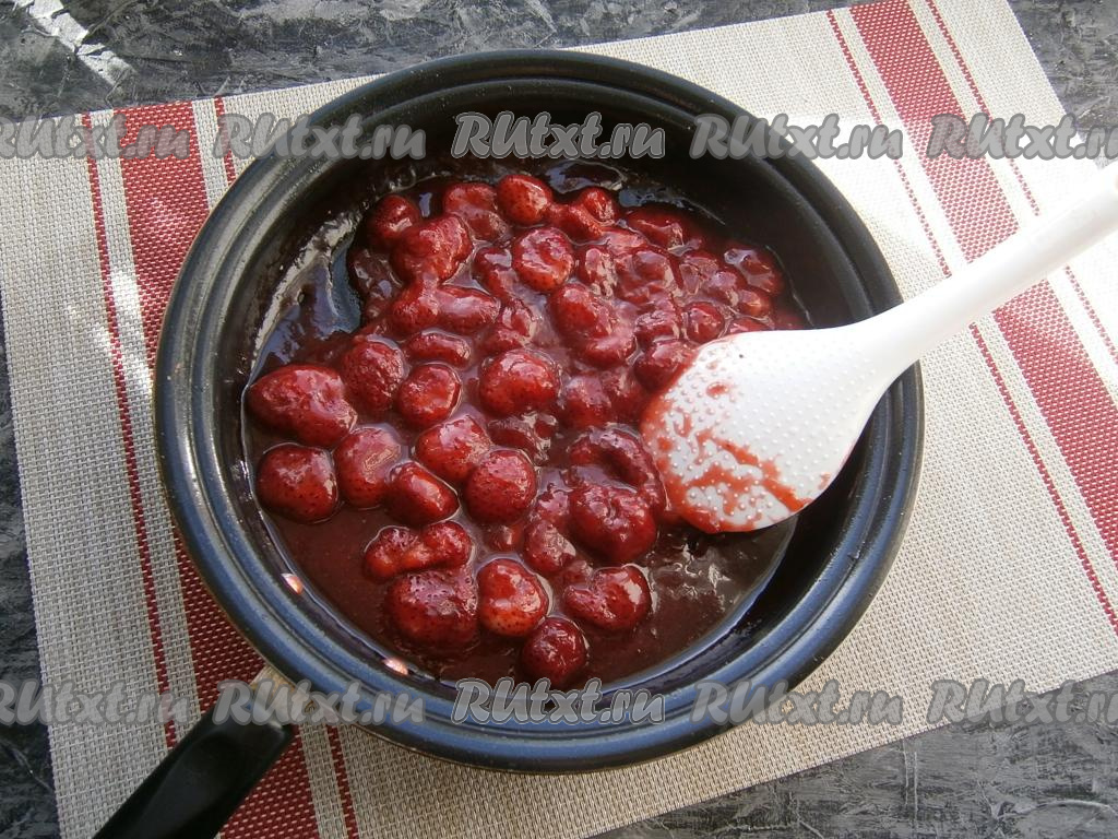 Влить крахмал в сковороду с клубникой и немного прогреть на небольшом огне. Клубничная начинка для блинов должна получиться, как густой кисель. Выключить огонь и дать клубничной начинке остыть.