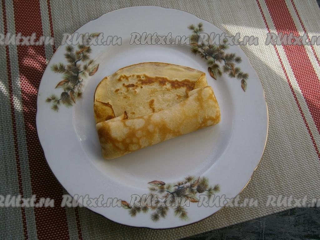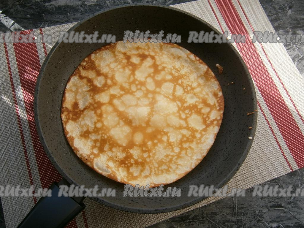 Пока начинка остывает, нужно пожарить блинчики, для этого на разогретую сковороду, смазанную растительным маслом (смазывать сковородку нужно перед жаркой только первого блина), вылить порцию теста, равномерно распределить и жарить блин с двух сторон до румяности на среднем огне, а затем переложить на тарелку. Пожарить таким образом все блины, складывая их на тарелку стопочкой.