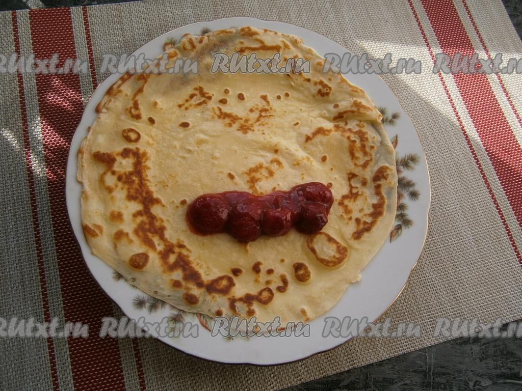 Теперь на каждый блинчик выложить по столовой ложке клубничной начинки ближе к краю.