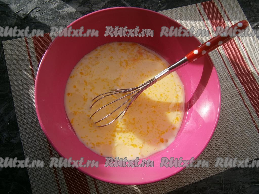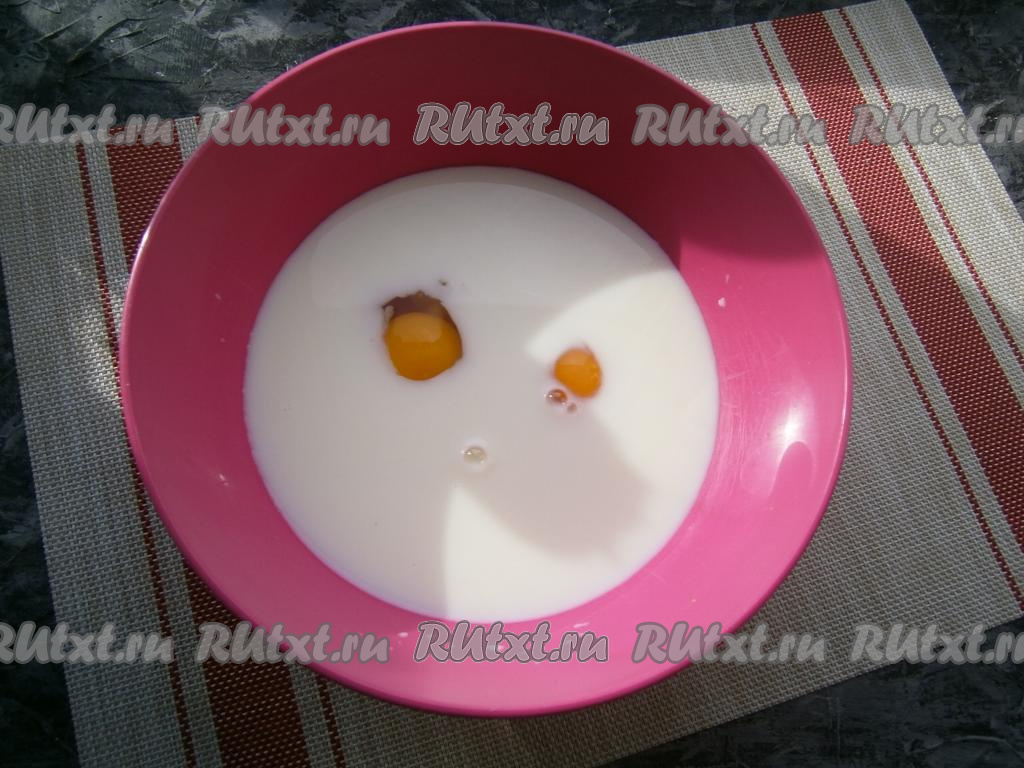 Налить молоко в миску, добавить сахар, соль и соду, вбить яйца.