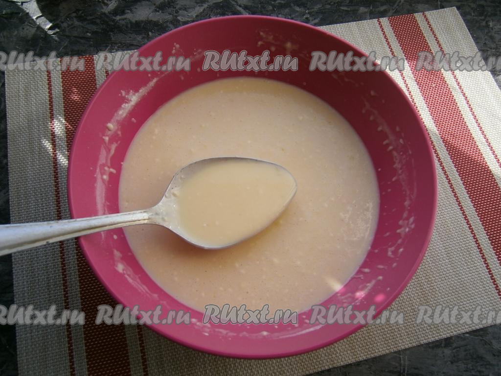 Венчиком замесить блинное тесто, по консистенции оно не слишком жидкое, но и не густое. Тесто оставить при комнатной температуре минут на 20, прикрыв полотенцем.