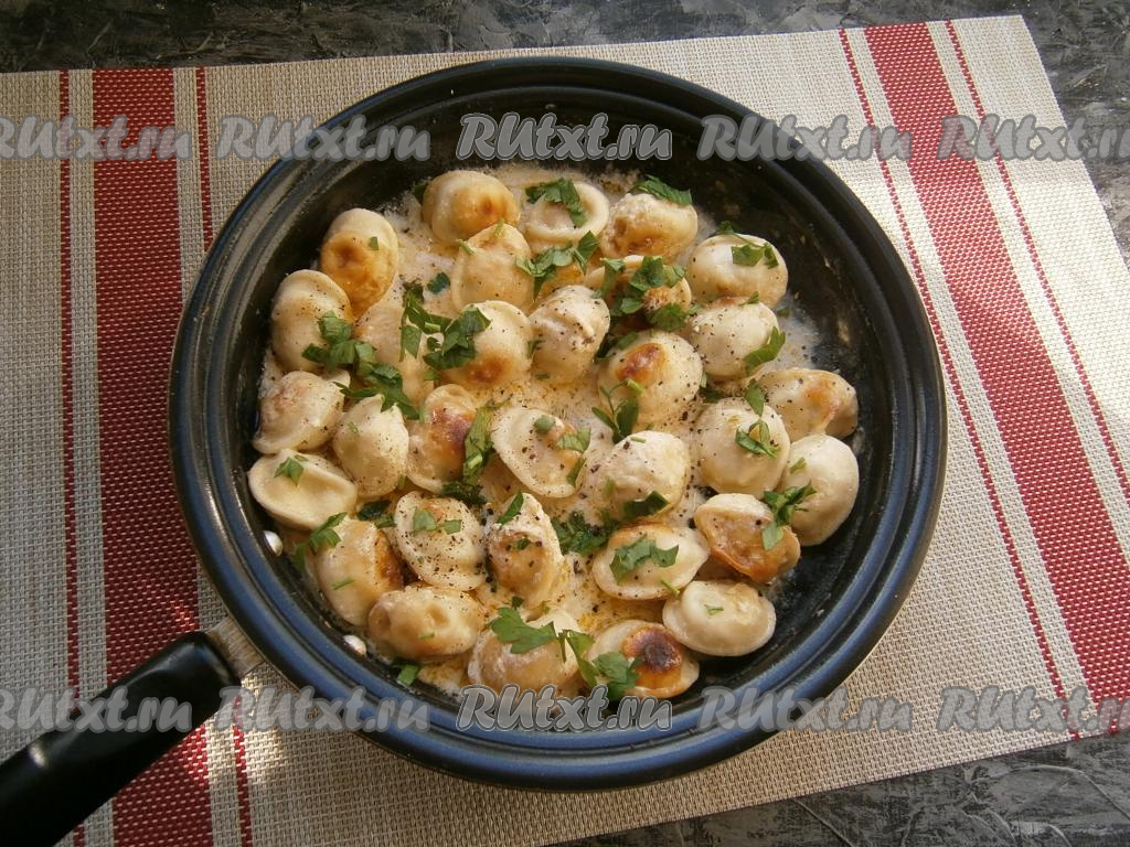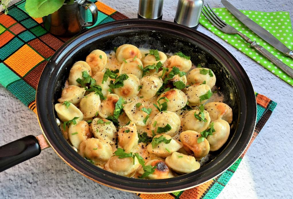 Вкуснейшие жареные пельмени, приготовленные со сметаной на сковороде, сразу же подать к столу!