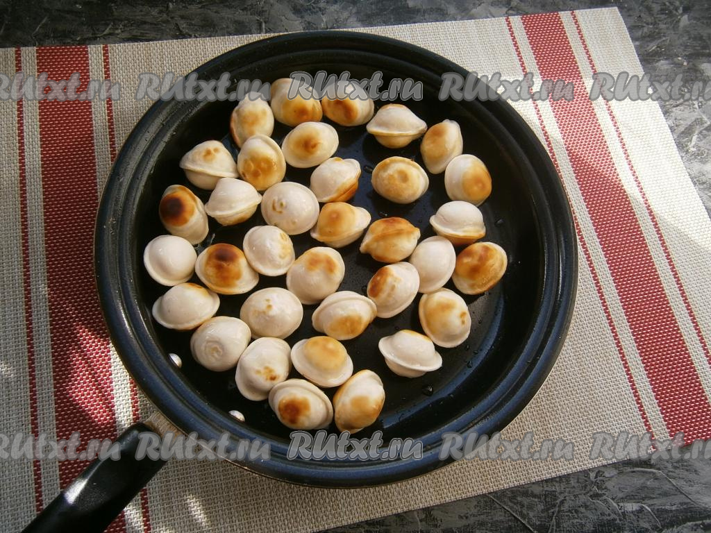 Обжарить пельмени на разогретом растительном масле на среднем огне до румяности, помешивая (4-6 минут).