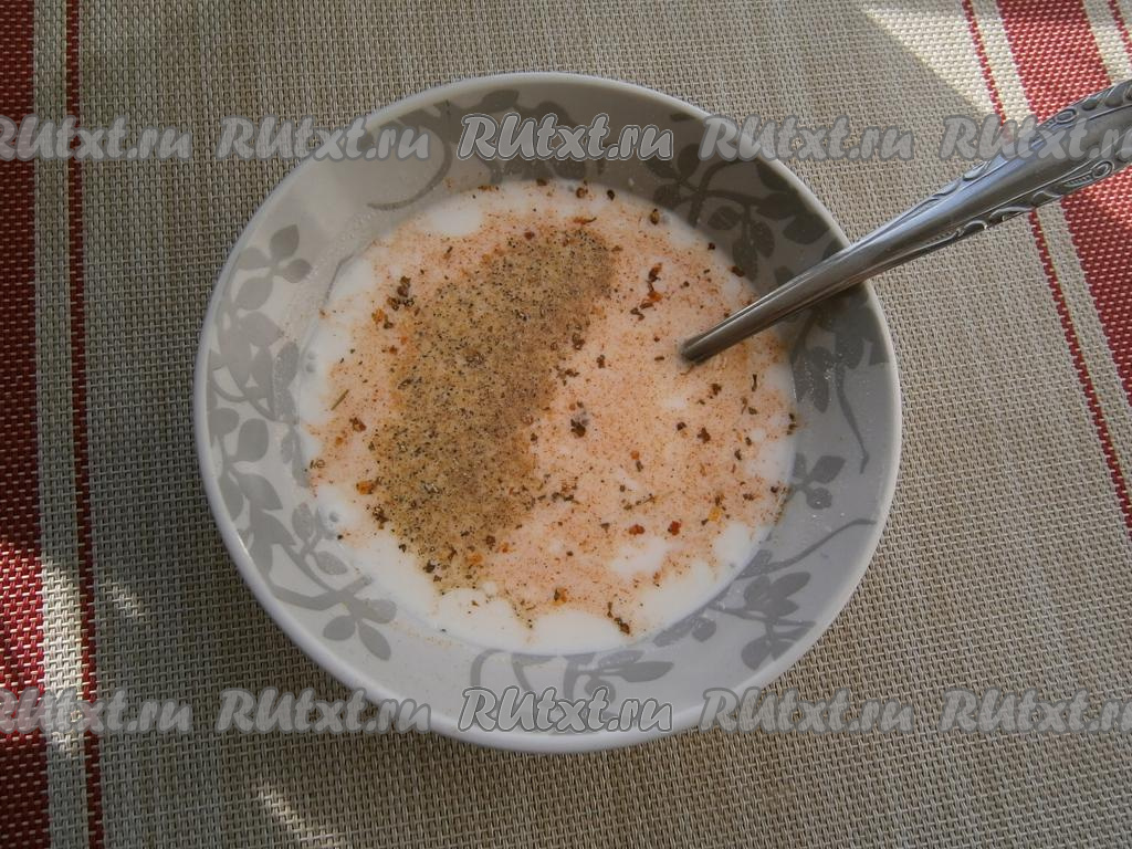 Сметану развести горячей водой до однородности, всыпать немного соли, специй и чёрного молотого перца, перемешать.