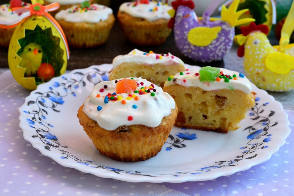 Теперь замечательные, очень вкусные и красивые творожные пасхальные кексы можно посыпать цветной посыпкой и подать на праздничный стол.