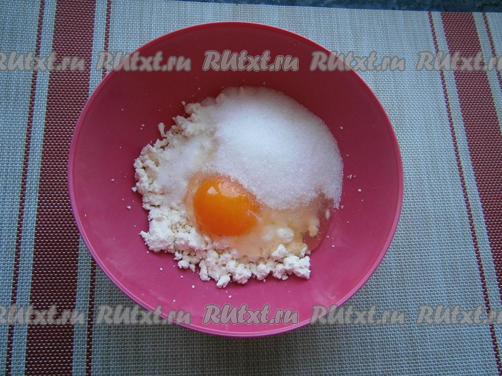 В творог всыпать сахар и ванильный сахар, добавить сырое яйцо и соль.
