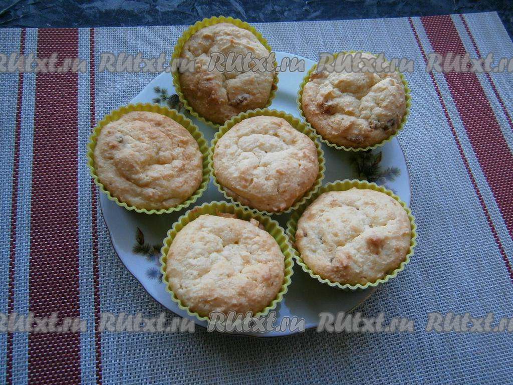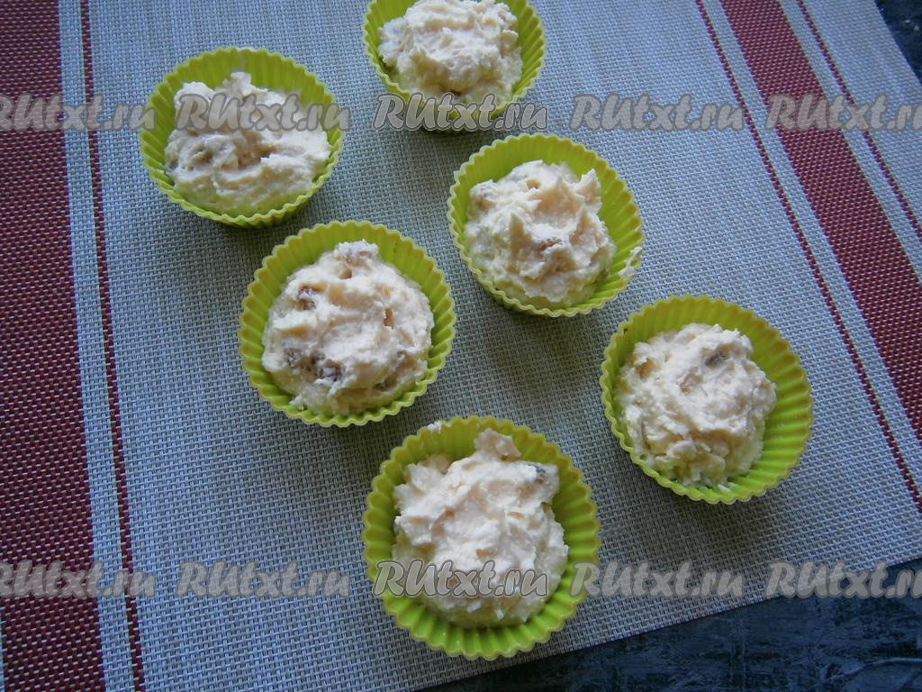 Печь творожные кексы в разогретой до 180 градусов духовке около 30-40 минут до румяности (готовность можно проверить деревянной шпажкой - шпажка останется абсолютно сухой при прокалывании готовых кексов). Дать кексам остыть, а затем вынуть их из формочек.