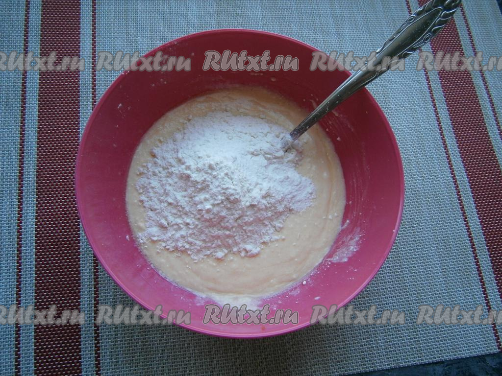 Тщательно массу перемешать, всыпать просеянную с разрыхлителем муку.