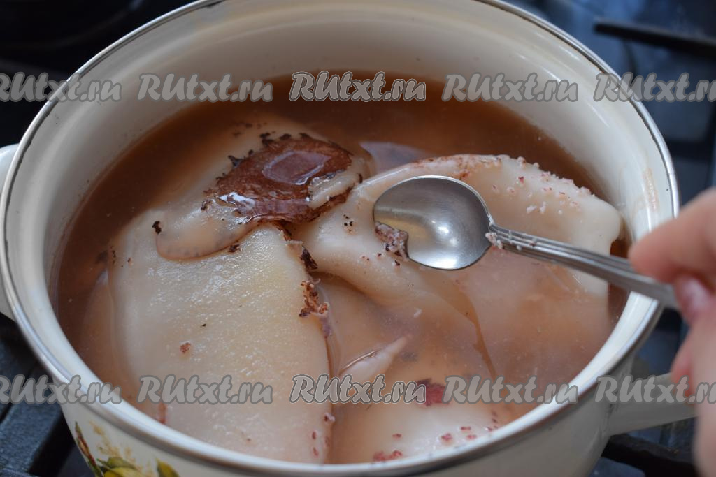 Тушки кальмаров размораживаем при комнатной температуре, промываем под проточной водой и удаляем все внутренности. В кастрюлю наливаем воду, ставим на огонь и даём закипеть, затем в кипящую воду опускаем тушки кальмаров, не очищенные от плёночки, и варим буквально 1-2 минуты, за это время тёмная плёночка на поверхности тушек свернётся, кальмар легко очистится.