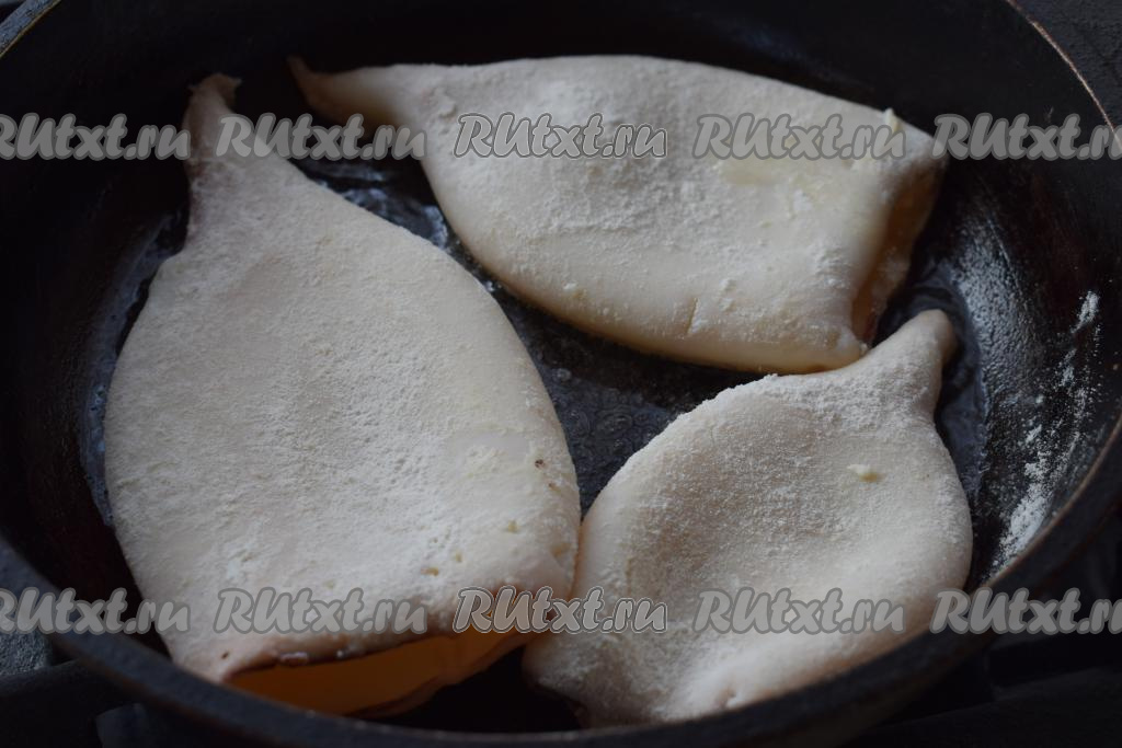 Жарим тушки кальмаров целиком на среднем огне по 4-5 минут с каждой стороны (до образования румяной корочки). Считается, что кальмаров нужно готовить не более 2-3 минут, иначе они получаются жёсткими, но в этом рецепте мука образует корочку на поверхности кальмара, поэтому он остаётся мягким, сочным и нежным, хотя и готовим мы его около 8-10 минут на сковороде.