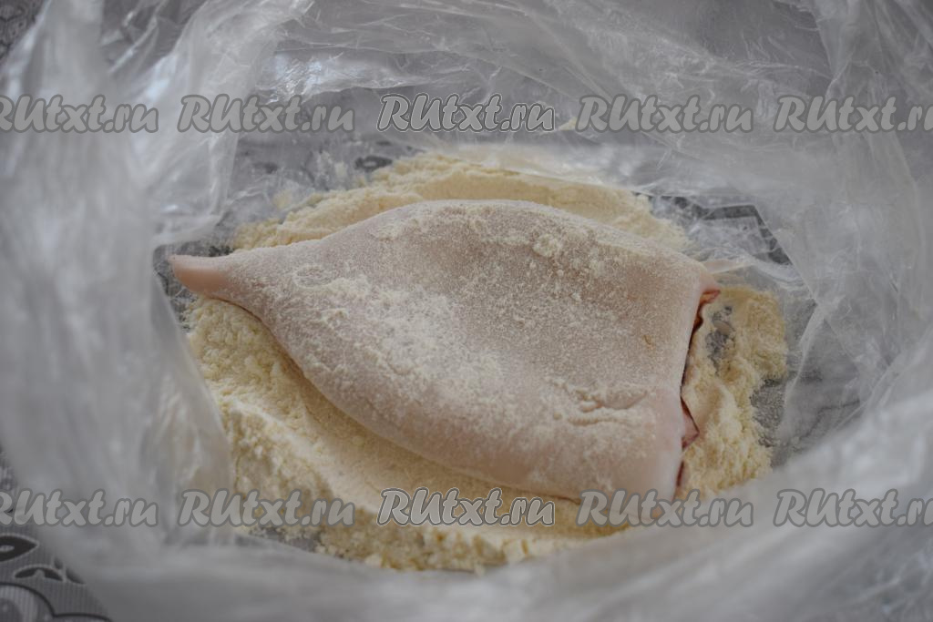 В пакет по одному выкладываем кальмаров и обваливаем в мучной смеси тушки со всех сторон.